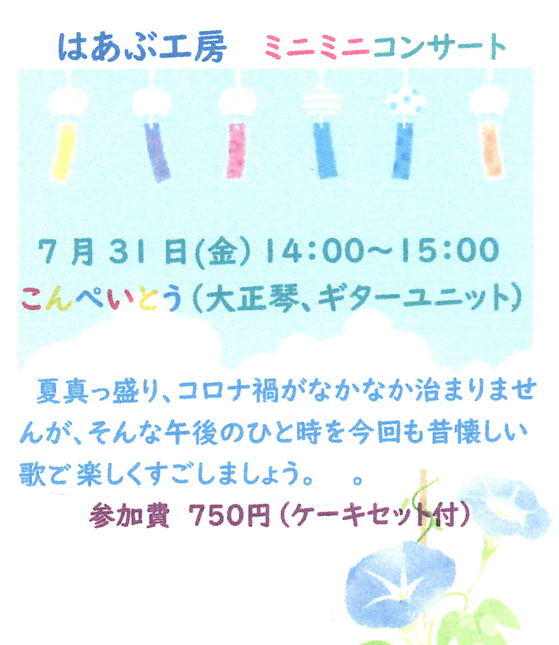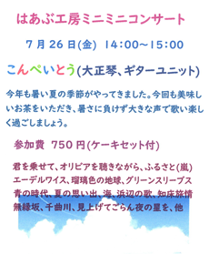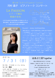 | 7/31(日) | 第66回 はばたけTogetherコンサート 「河村晶子ピアノトークコンサート」 | |