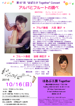 | 10/16(日) | 第67回 はばたけTogetherコンサート 「アルパとフルートの調べ」 | |