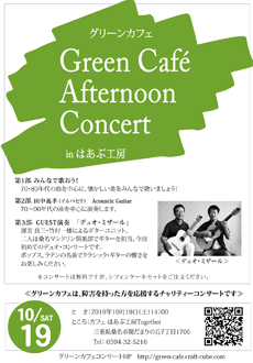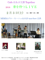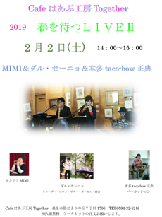| 演奏:mica & feat.チハル 音楽を聴きながらランチやお茶。 ゆっくりとお楽しみください。 |
