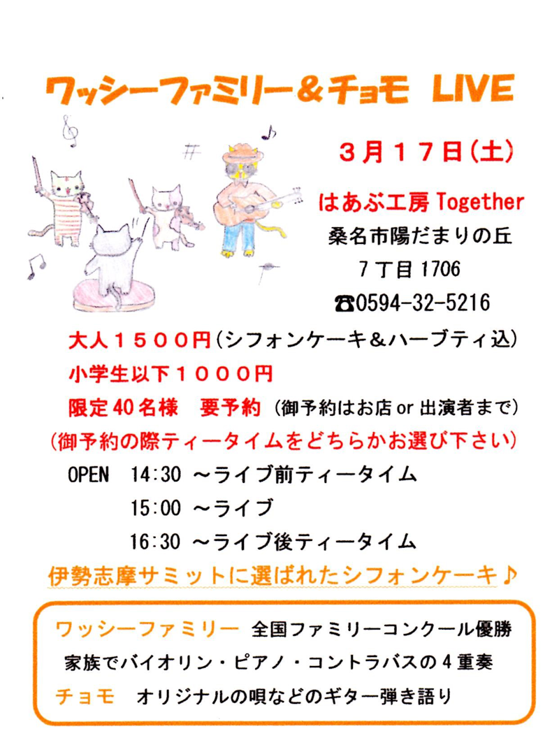 ハンガリーの民族楽器"コカリナ"の音色を楽しみながら、ふわふわのシフォンケーキとハーブティーでリラックス♪ 演奏:コカリン5 ※ライブタイムはケーキセットのご利用をお願いします。 |