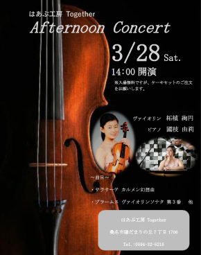 ヴァイオリン:柘植絢円、鷲野仁美 ピアノ:古田友哉 ※ケーキセットのご利用をお願いします。 |