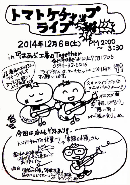 「トマトケチャップ」:日々の思いを徒然なるままにオリジナルソングにして歌います! 「イルパセリ」:70年代のフォークソングを歌います。 ※ライブタイムは、ランチまたはケーキセットのご利用をお願いします。 |