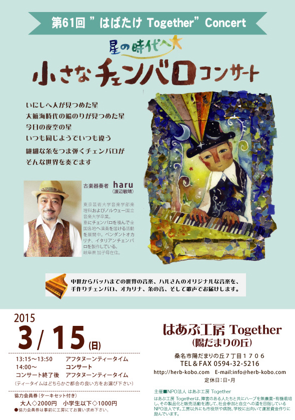 2/14(日)14:00~ 第63回 はばたけTogetherコンサート オカリナ&ギターの調べとともに 詳細> |