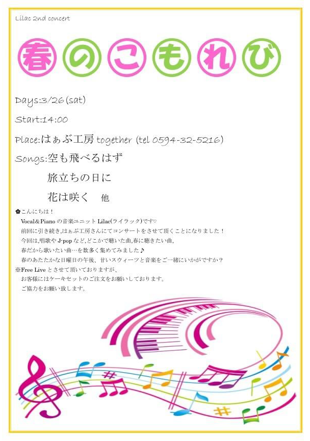 | 03/26(土)14:00~ Lilac 2nd Concert、春のこもれび | |