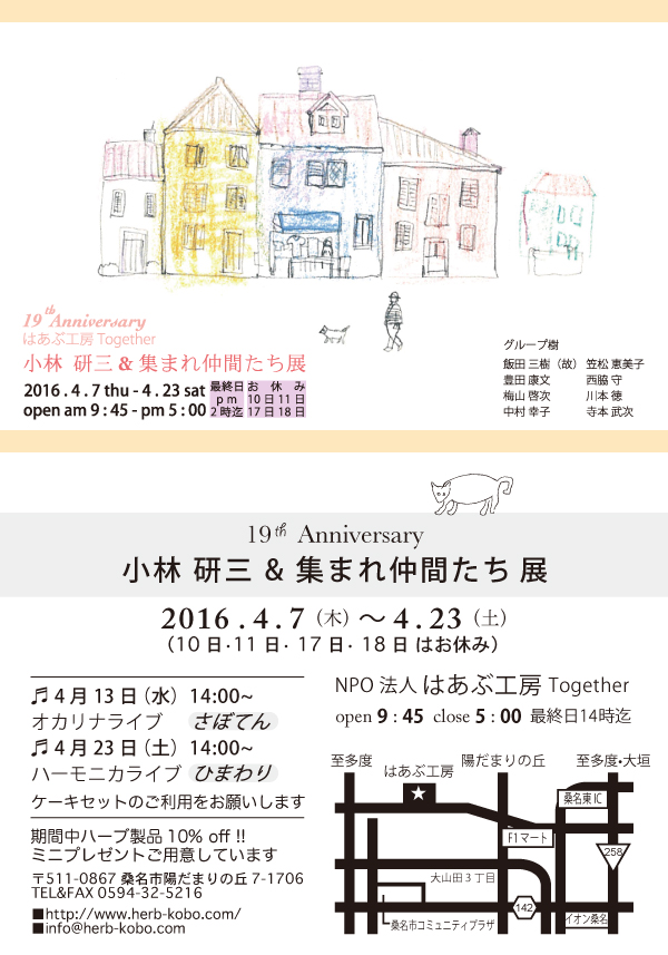 はあぶ工房Togetherは、皆さまに支えられまもなく14周年(移転6周年) を迎えます。今年も小林研三先生の写真や絵と共に「グループ樹」の皆さまの作品を展示いたします。 | |