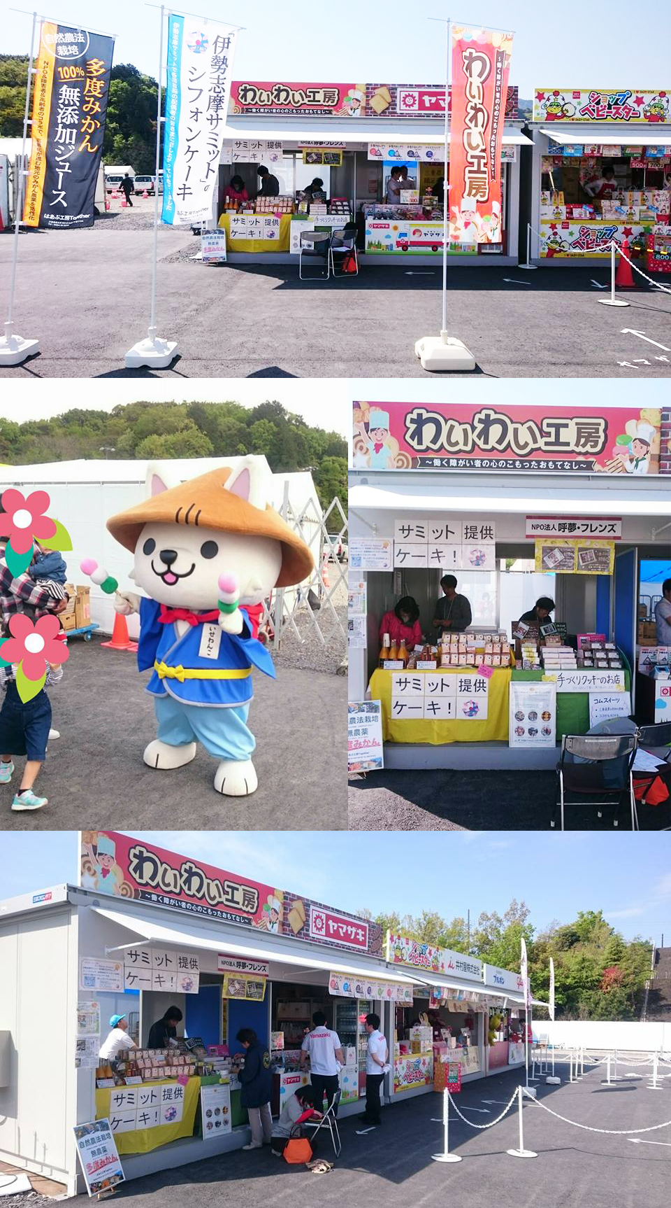 本日、今話題のお菓子博に出店しに伊勢まで行って来ました。 GW初日、いいお天気ということもあり大勢のお客様が来場され、沢山準備したケーキもお昼頃には完売!! ジュースも多く売れ、どちらも「おいしい!」と喜んでいただけました♪ 本当にありがとうございました(*^^*)♪ お隣の山崎製パンさんをはじめ、大手お菓子メーカーの方々、同日一緒に出店した来夢さんにはお世話になりました。ありがとうございました。 突然突風が吹き荒れることもありましたが、無事終えることができました。 広ーい会場内は日陰が少ないので、この先お菓子博へ行かれる方は熱中症にお気をつけ下さいませ。